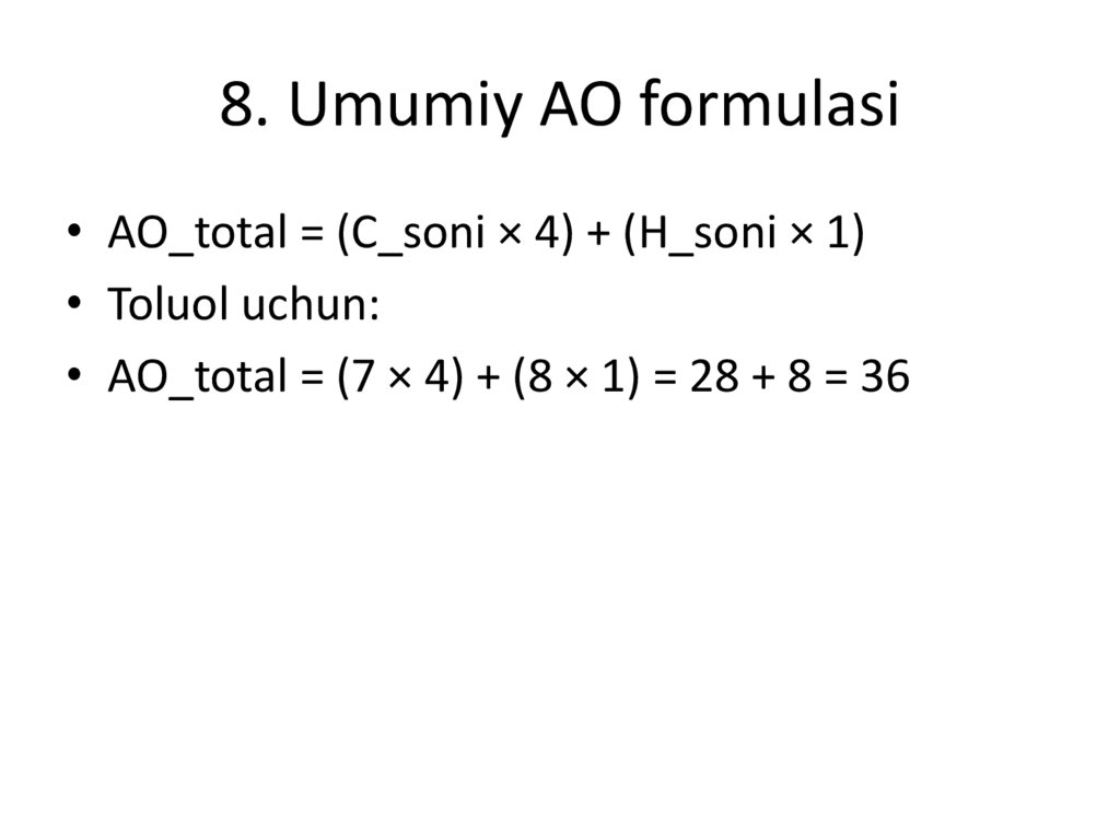 8. Umumiy AO formulasi• AO_total = (C_soni × 4) + (H_soni × 1)