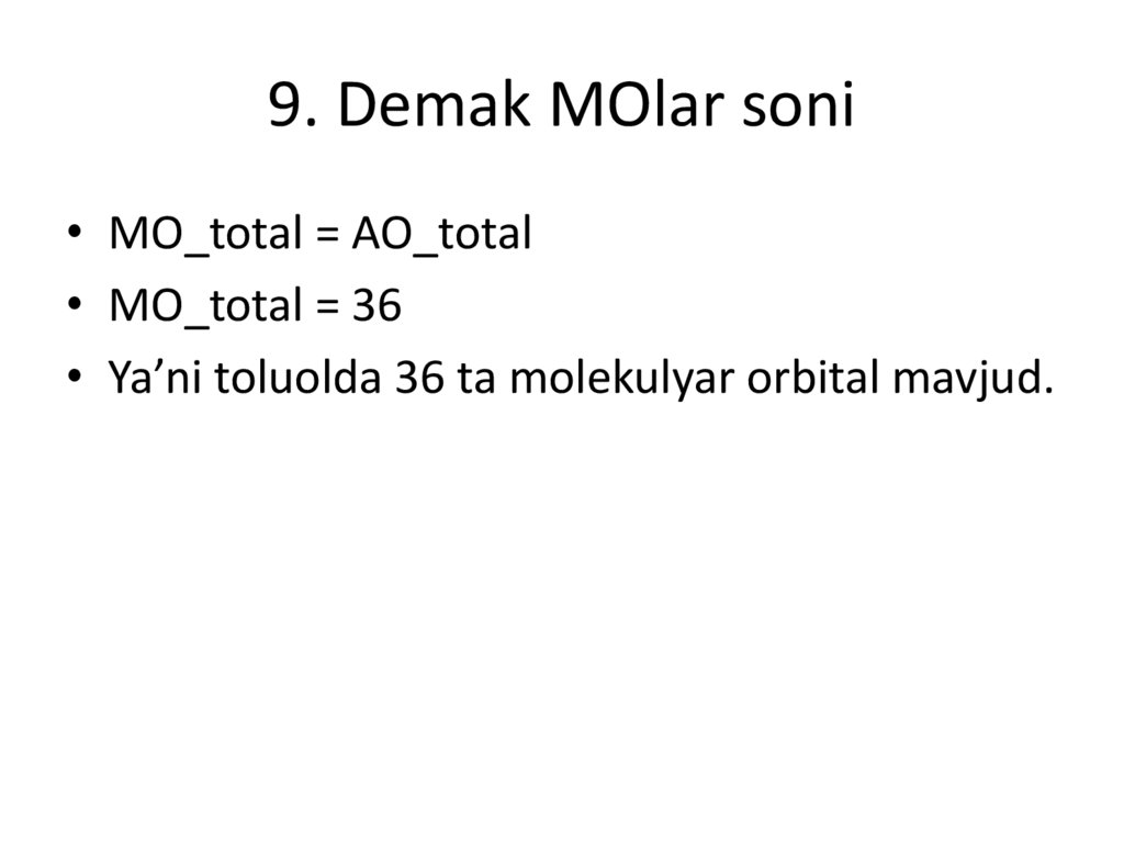• Aniq va to‘liq molekulyar orbitalar soni: 36