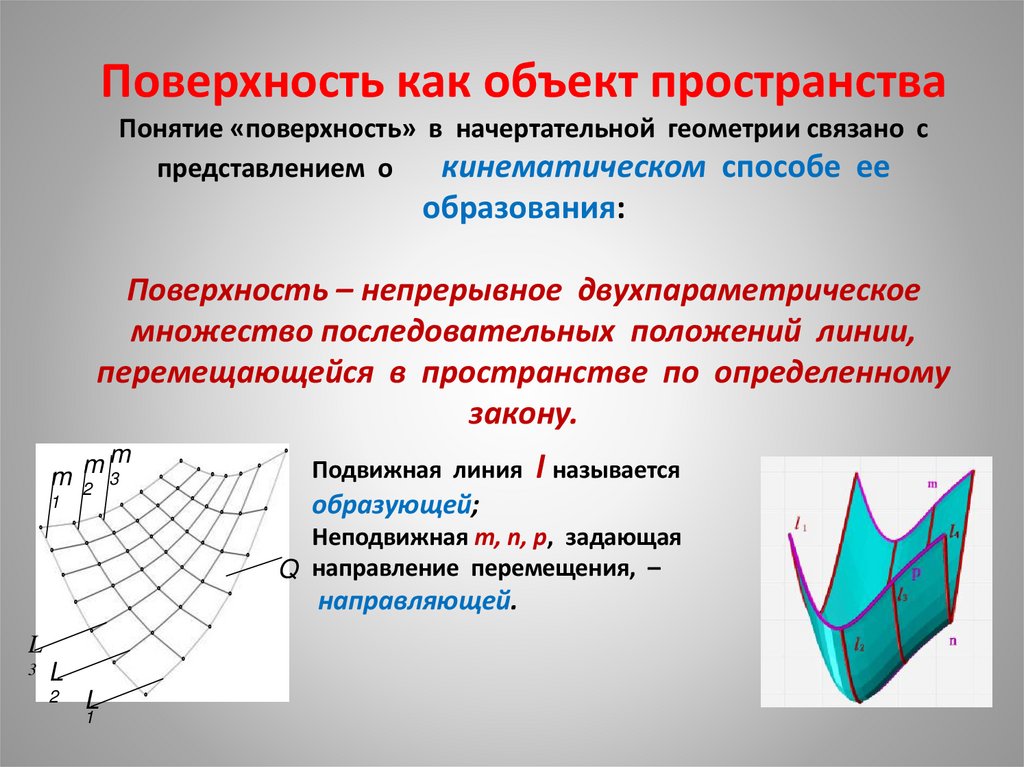 1. Поверхность как объект пространства Понятие «поверхность» в начертательной геометрии связано с представлением о кинематическом