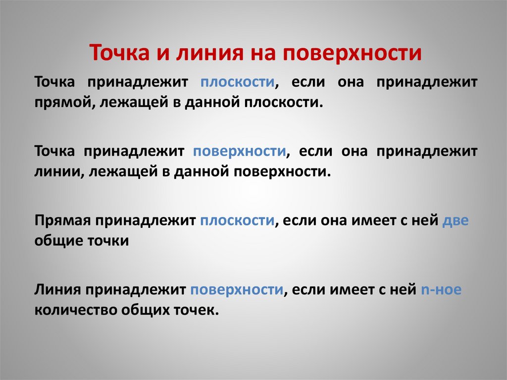 Точка и линия на поверхностиТочка принадлежит плоскости, если она принадлежит