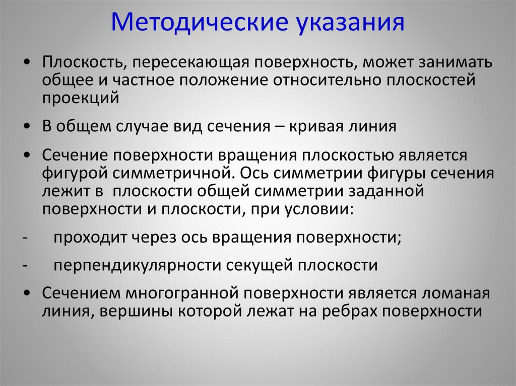 Методические указания• Плоскость, пересекающая поверхность, может занимать