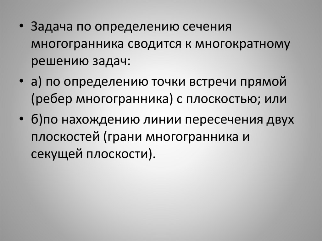 • Задача по определению сечениямногогранника сводится к многократному