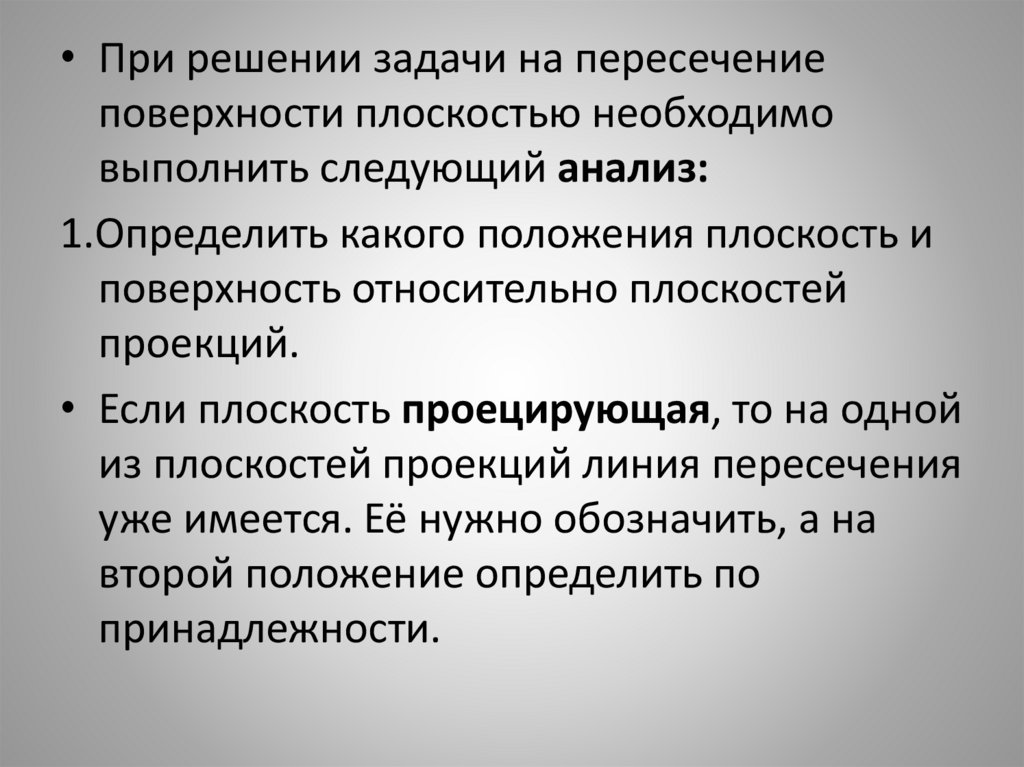 • При решении задачи на пересечениеповерхности плоскостью необходимо