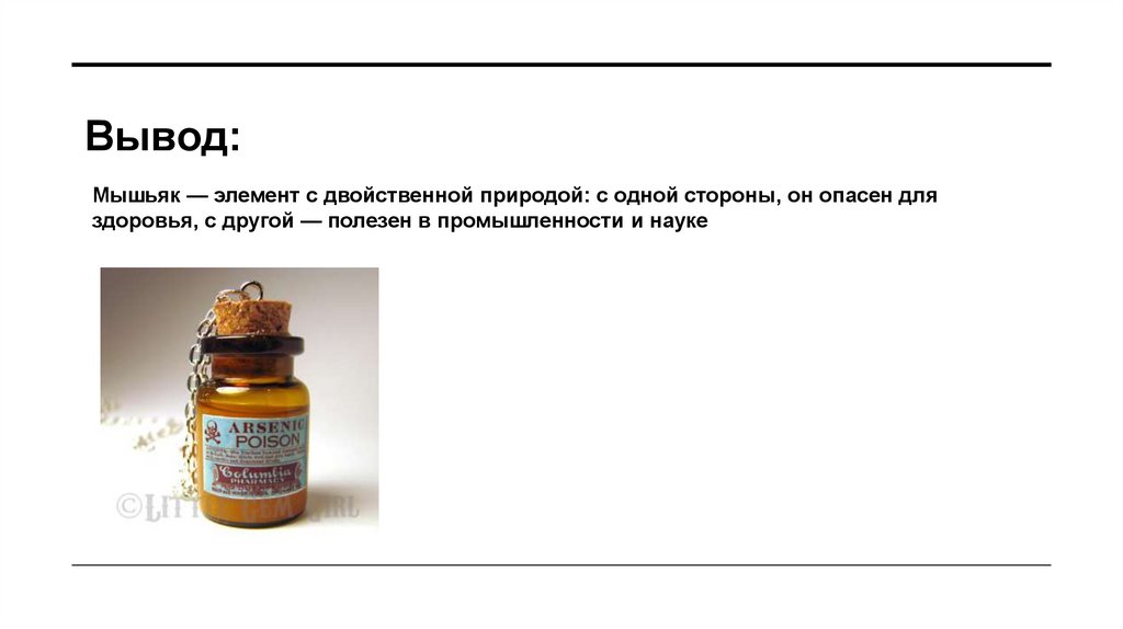 Вывод:Мышьяк — элемент с двойственной природой: с одной стороны, он опасен для