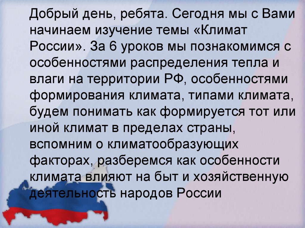 Добрый день, ребята. Сегодня мы с Ваминачинаем изучение темы «Климат