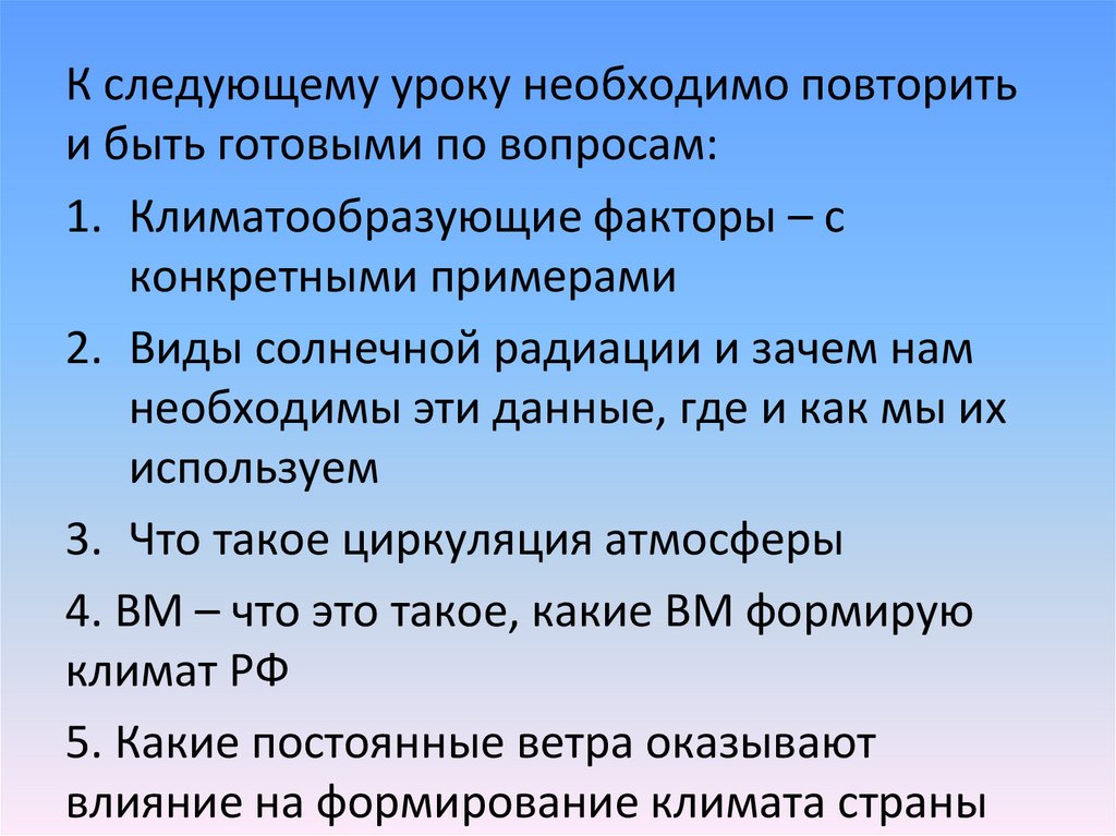 К следующему уроку необходимо повторитьи быть готовыми по вопросам: