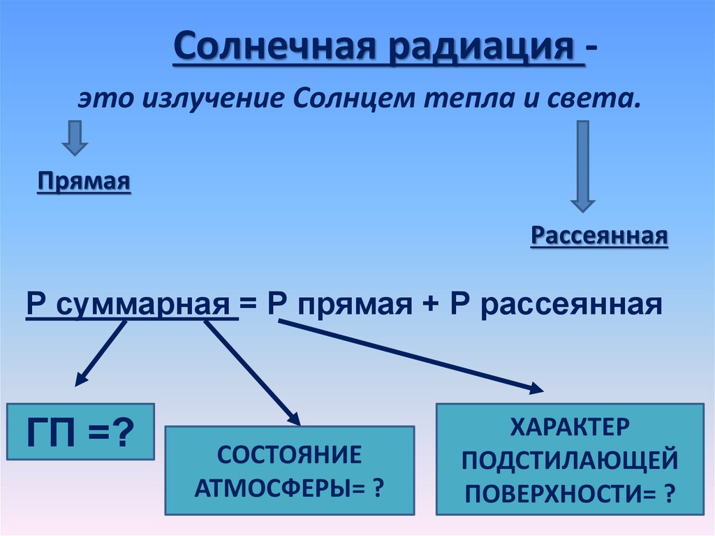 Солнечная радиация это излучение Солнцем тепла и света.Прямая