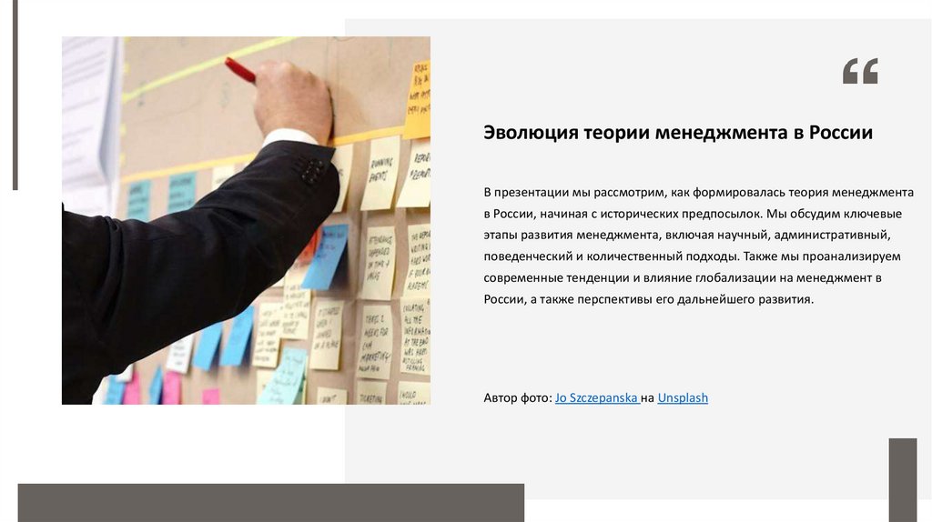 Эволюция теории менеджмента в РоссииВ презентации мы рассмотрим, как формировалась теория менеджмента
