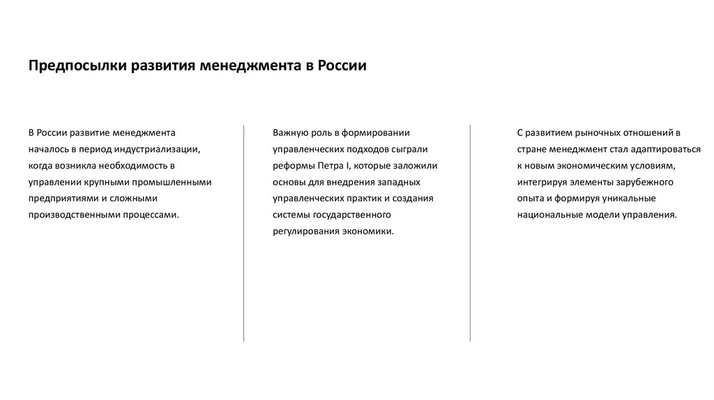 Предпосылки развития менеджмента в РоссииВ России развитие менеджмента