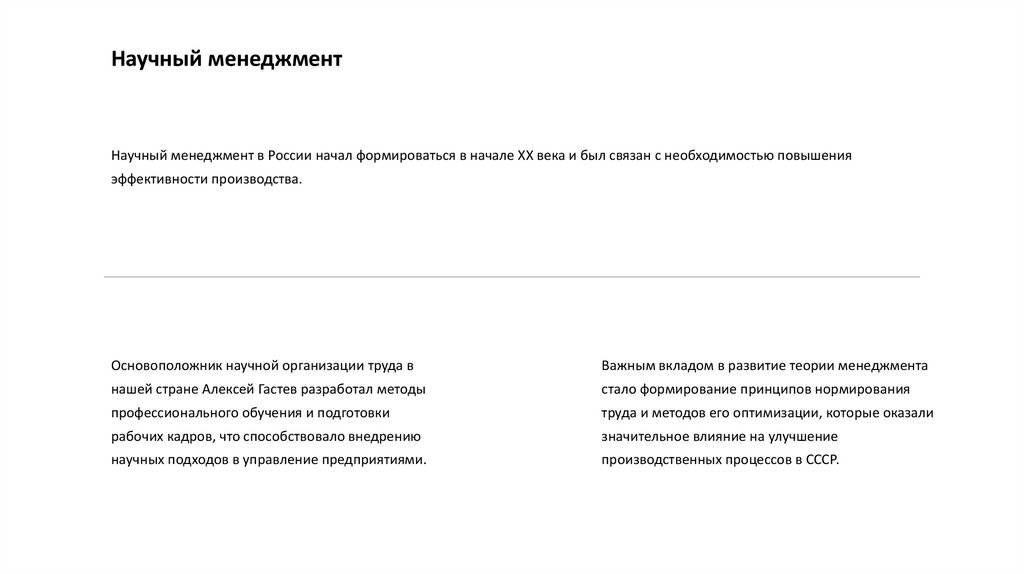 Научный менеджментНаучный менеджмент в России начал формироваться в начале XX века и был связан с необходимостью повышения