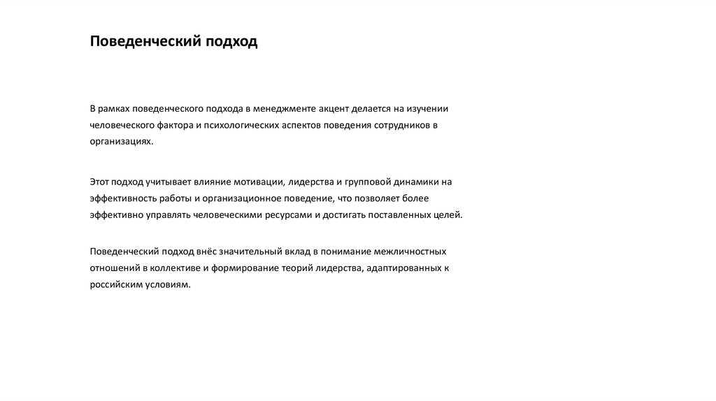 Поведенческий подходВ рамках поведенческого подхода в менеджменте акцент делается на изучении