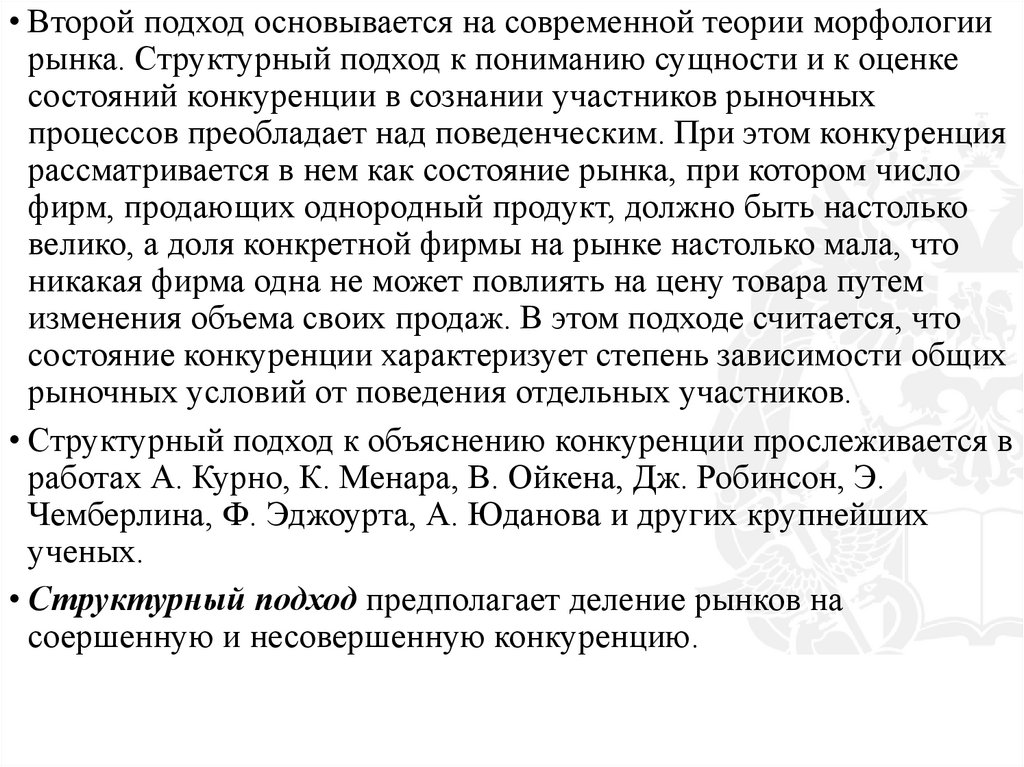 • Второй подход основывается на современной теории морфологиирынка. Структурный подход к пониманию сущности и к оценке