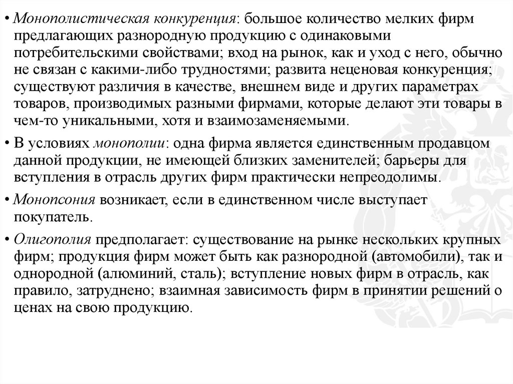 • Монополистическая конкуренция: большое количество мелких фирмпредлагающих разнородную продукцию с одинаковыми