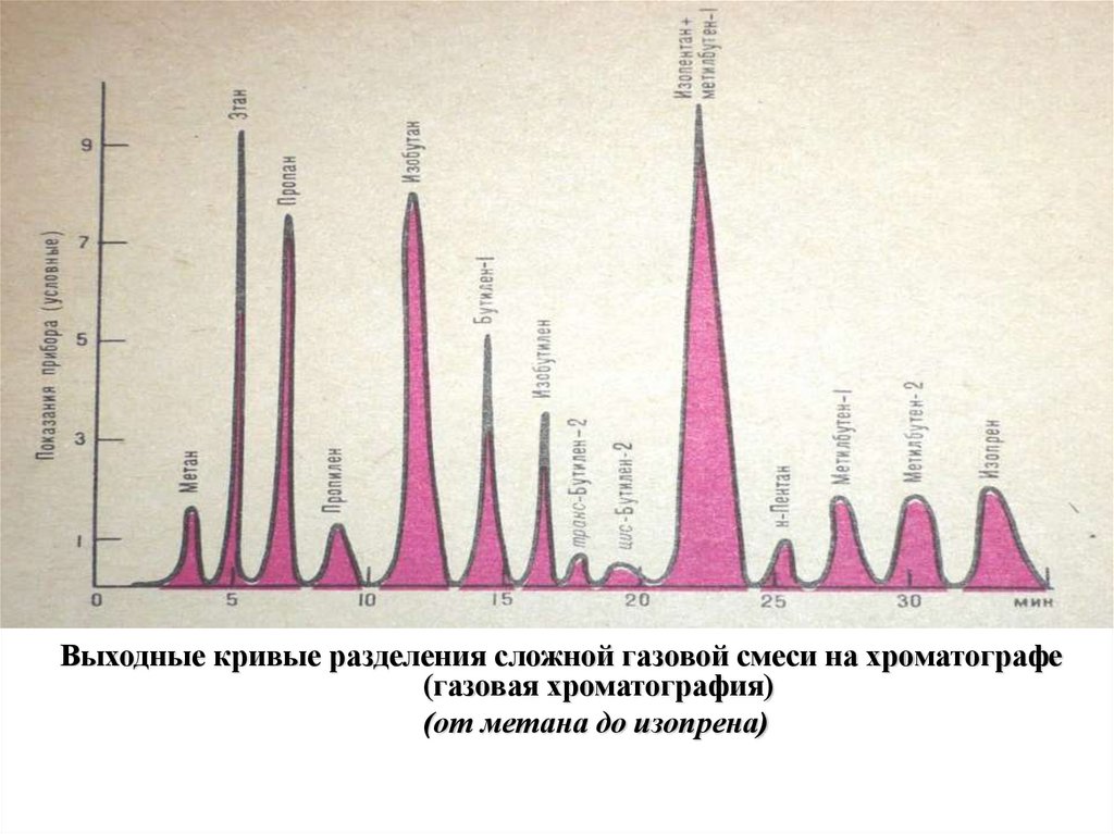 Выходные кривые разделения сложной газовой смеси на хроматографе(газовая хроматография)