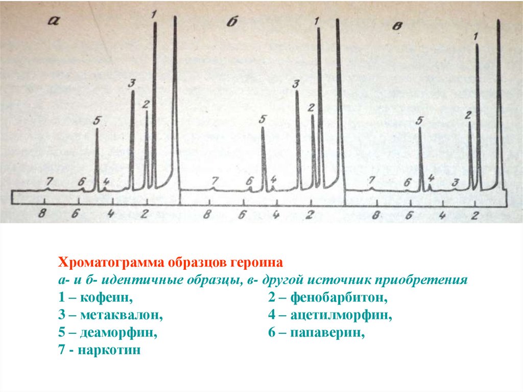 Хроматограмма образцов героинаа- и б- идентичные образцы, в- другой источник приобретения