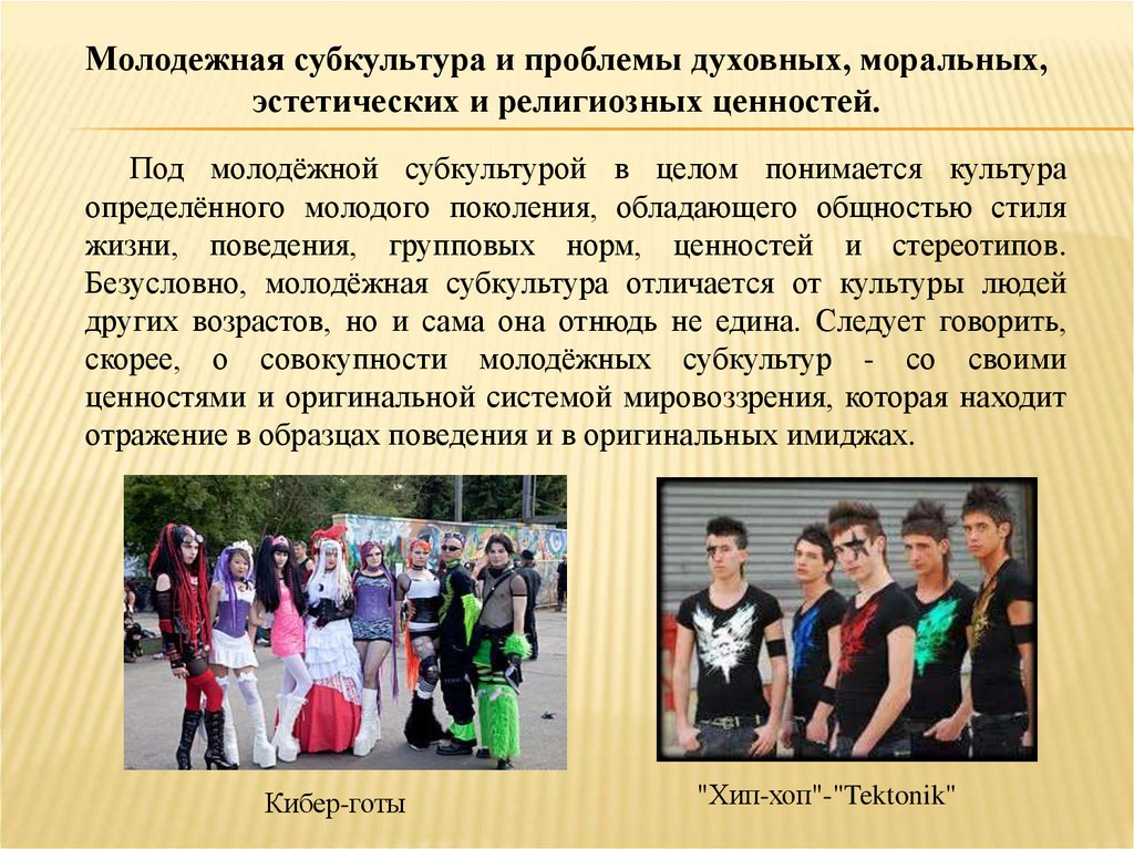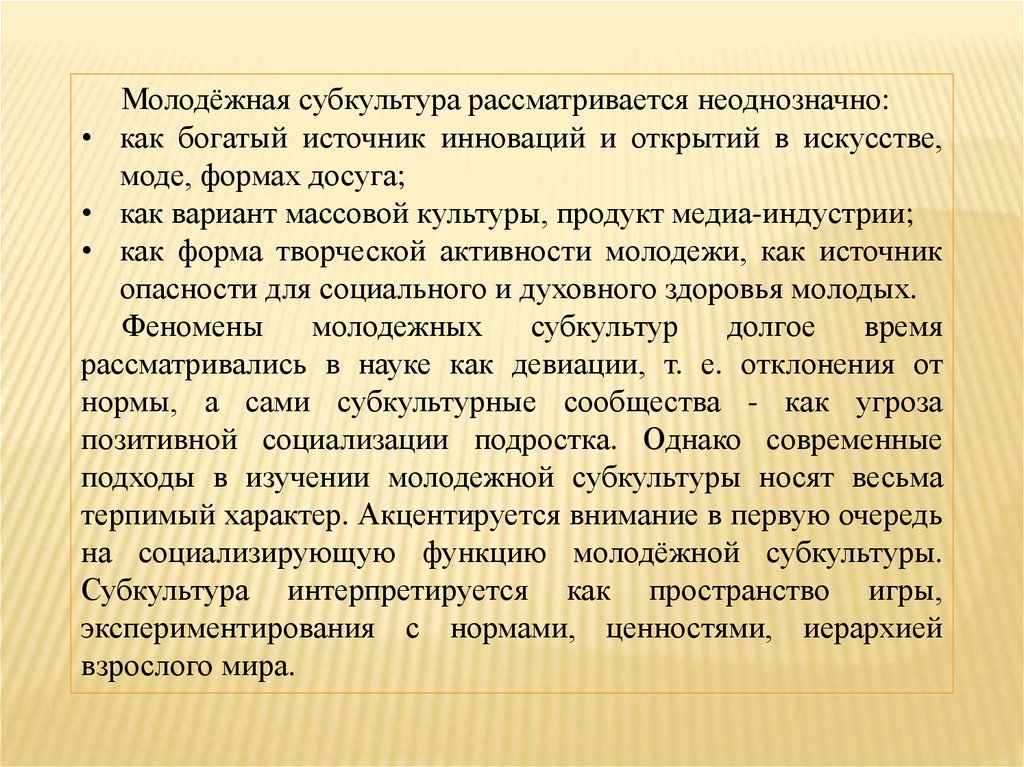 Молодёжная субкультура рассматривается неоднозначно:• как богатый источник инноваций и открытий в искусстве,