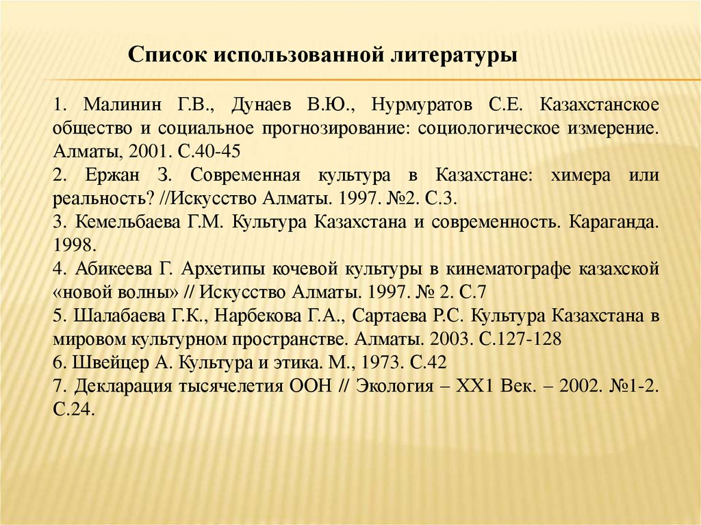 Список использованной литературы1. Малинин Г.В., Дунаев В.Ю., Нурмуратов С.Е. Казахстанское
