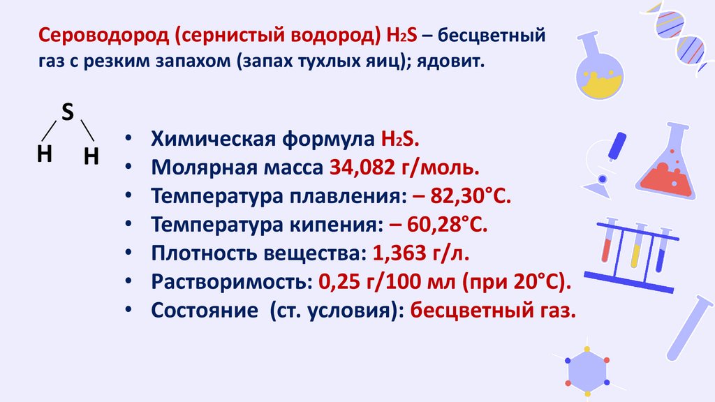 Сероводород (сернистый водород) H2S – бесцветныйгаз с резким запахом (запах тухлых яиц); ядовит.