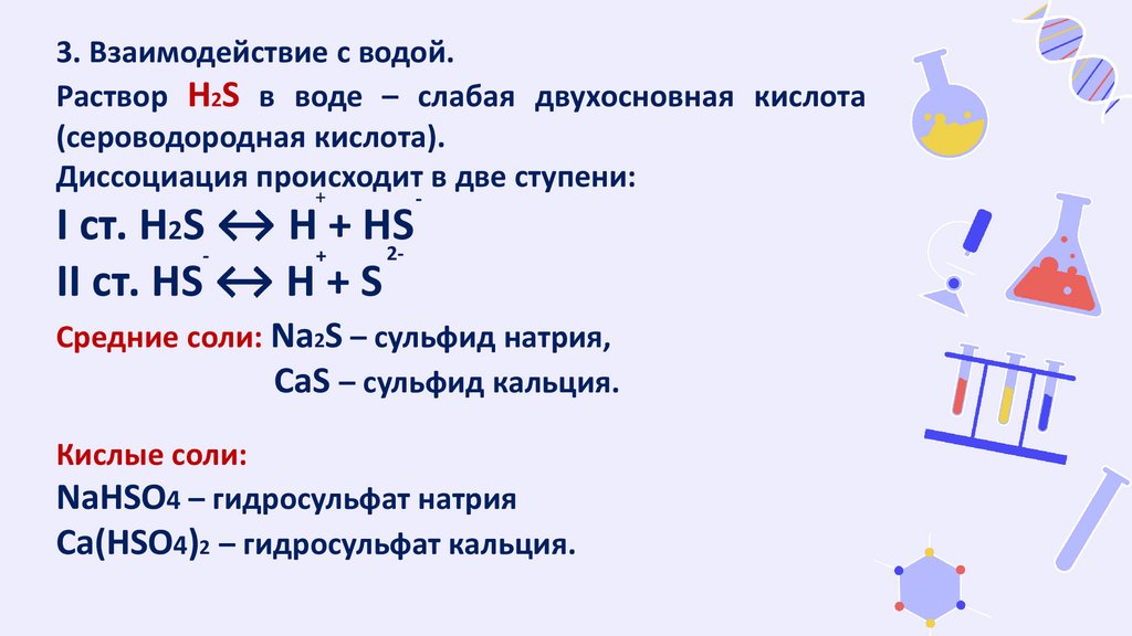 3. Взаимодействие с водой.Раствор H2S в воде – слабая двухосновная кислота