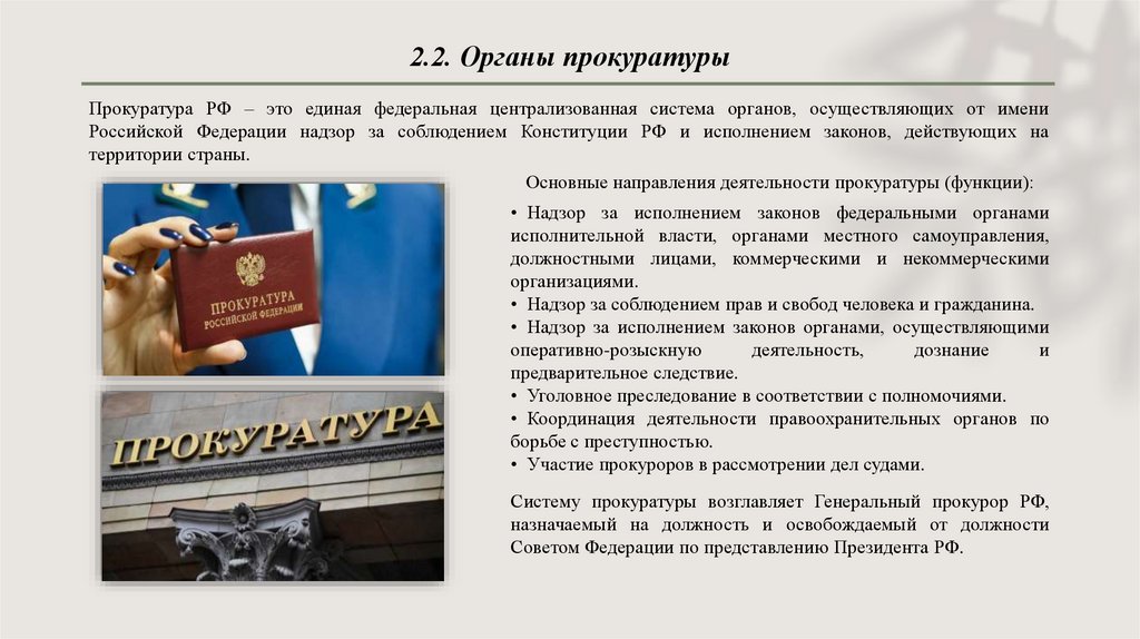 2.2. Органы прокуратурыПрокуратура РФ – это единая федеральная централизованная система органов, осуществляющих от имени
