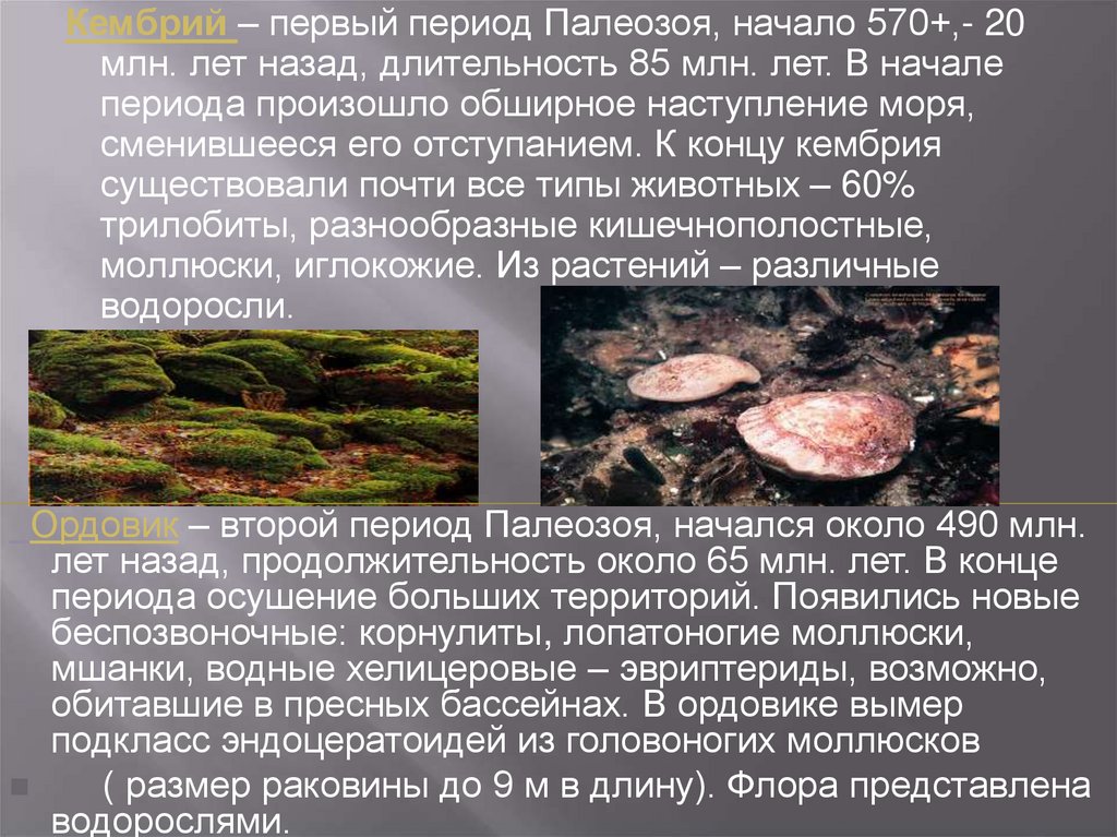 Кембрий – первый период Палеозоя, начало 570+,- 20млн. лет назад, длительность 85 млн. лет. В начале