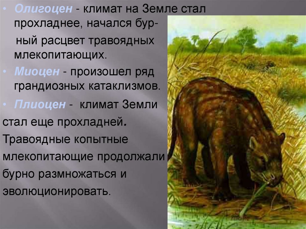 Изменение климатических условий привело к образованиюобширных степей, что благоприятствовало развитию копытных.
