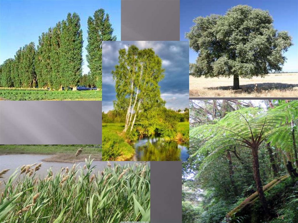 берёзы, на севере-ели, сосны, берёзы, осоки и