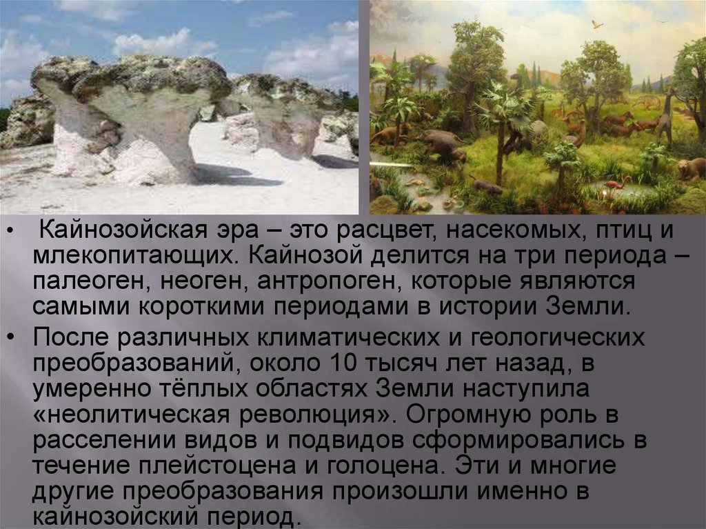 Кайнозойская эра – это расцвет, насекомых, птиц имлекопитающих. Кайнозой делится на три периода –