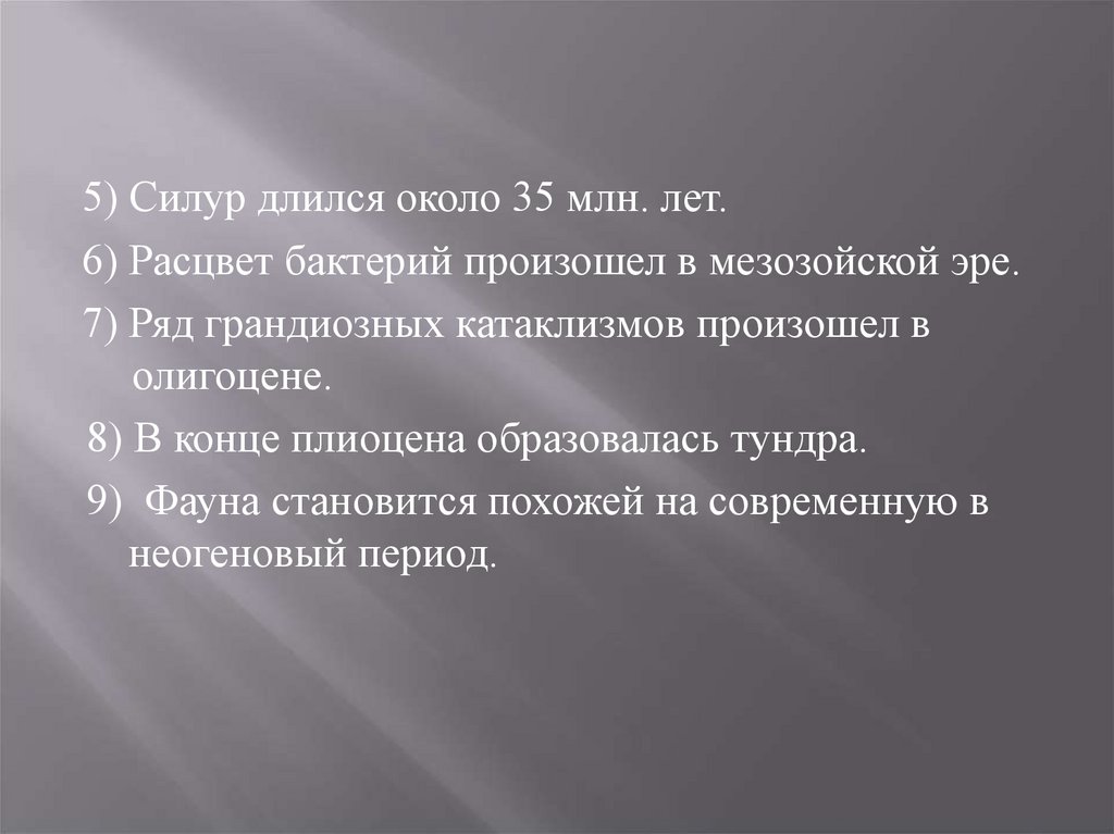 5) Силур длился около 35 млн. лет.6) Расцвет бактерий произошел в мезозойской эре.