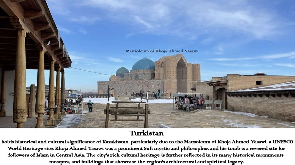 World Heritage site. Khoja Ahmed Yasawi was a prominent Sufi mystic and philosopher, and his tomb is a revered site for