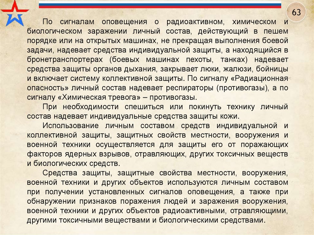 По сигналам оповещения о радиоактивном, химическом ибиологическом заражении личный состав, действующий в пешем