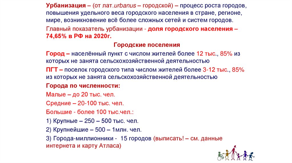Урбанизация – (от лат.urbanus – городской) – процесс роста городов,повышения удельного веса городского населения в стране, регионе,