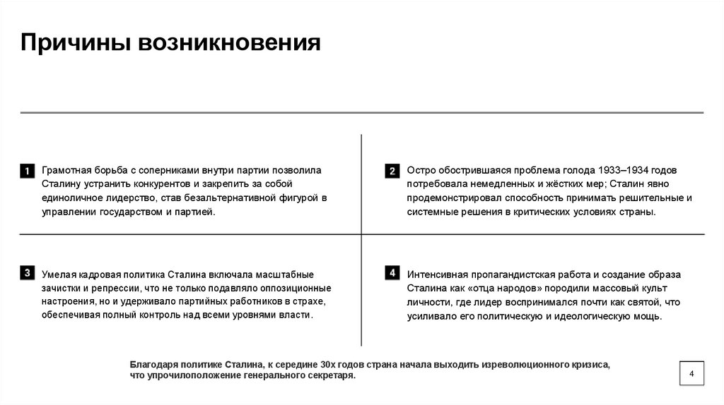Причины возникновенияГрамотная борьба с соперниками внутри партии позволила