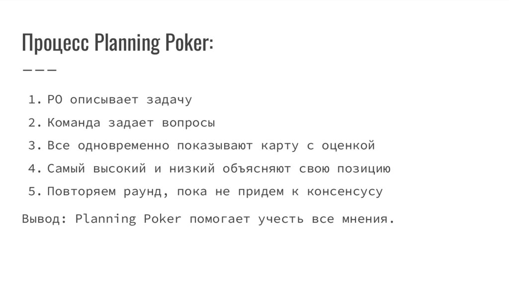 Вывод: Planning Poker помогает учесть все мнения.