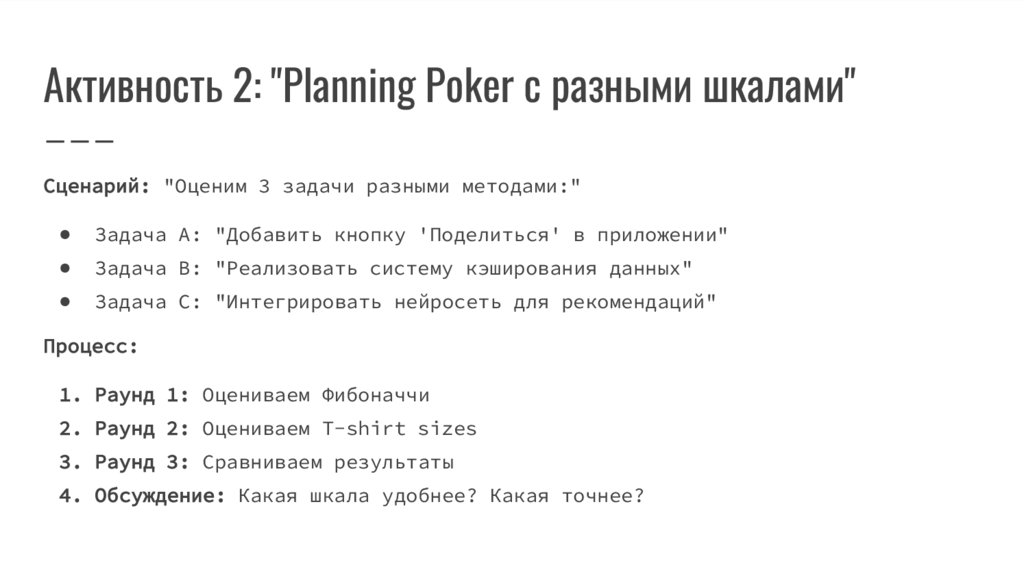 Активность 2: "Planning Poker с разными шкалами"Сценарий: "Оценим 3 задачи разными методами:"
