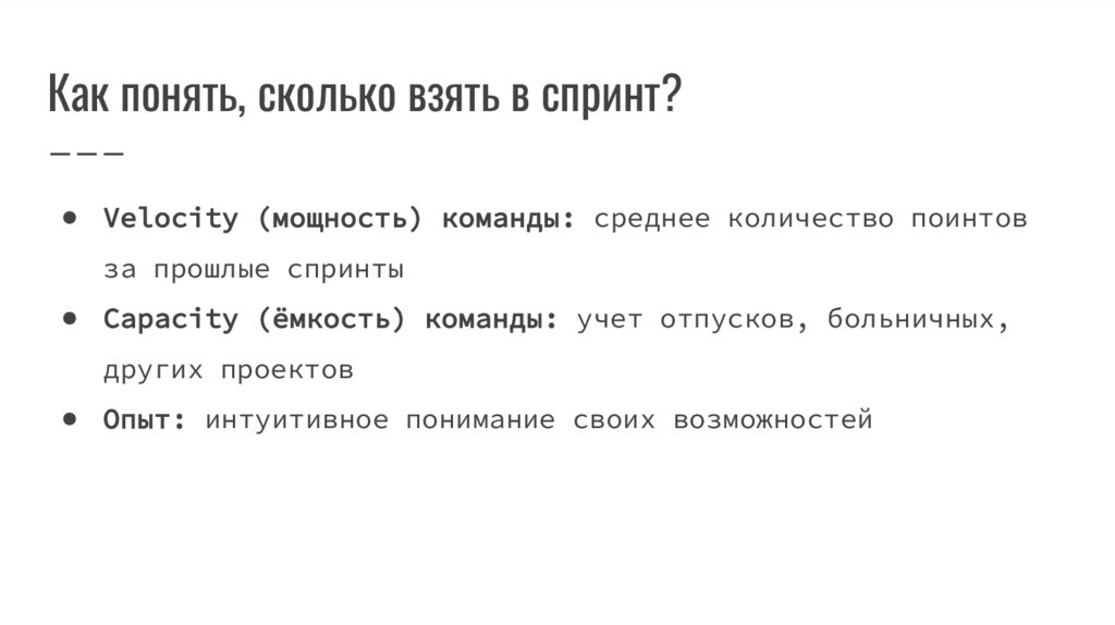 Как понять, сколько взять в спринт?● Velocity (мощность) команды: среднее количество поинтов