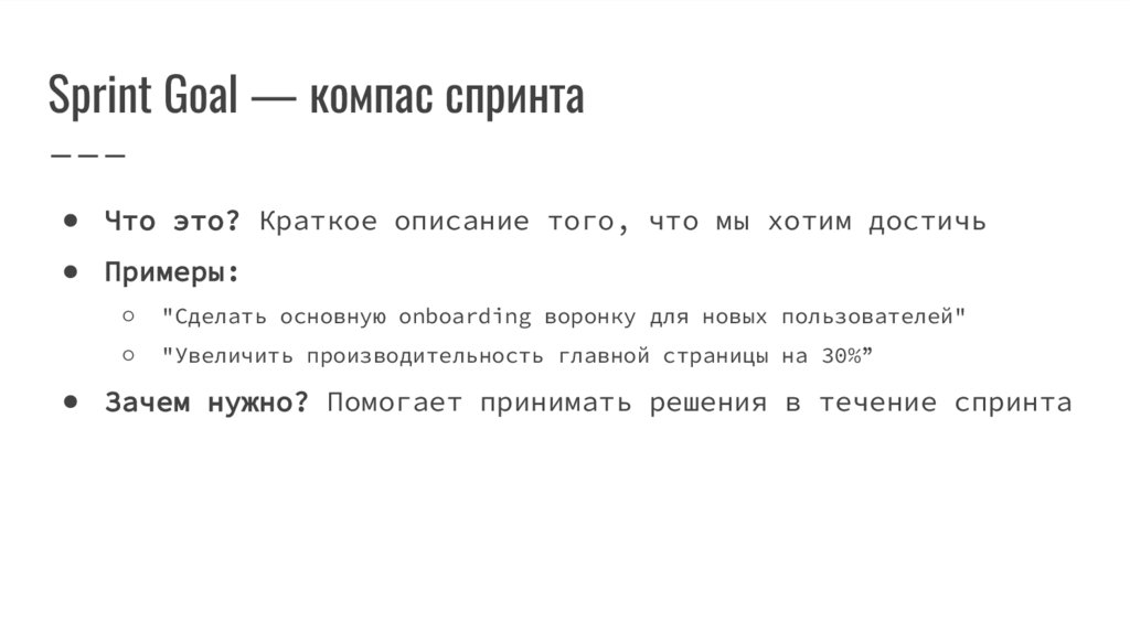 Sprint Goal — компас спринта● Что это? Краткое описание того, что мы хотим достичь