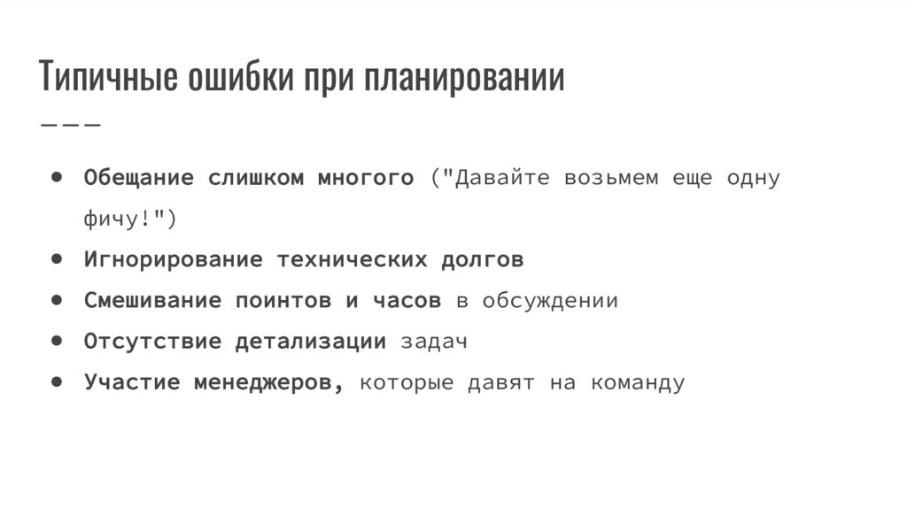 Типичные ошибки при планировании● Обещание слишком многого ("Давайте возьмем еще одну