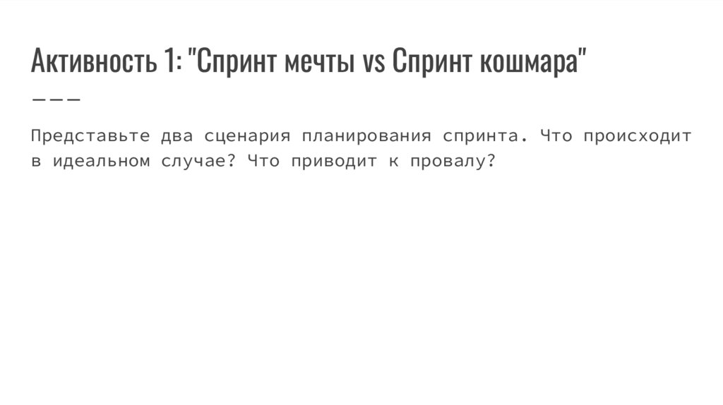 Активность 1: "Спринт мечты vs Спринт кошмара"Представьте два сценария планирования спринта. Что происходит