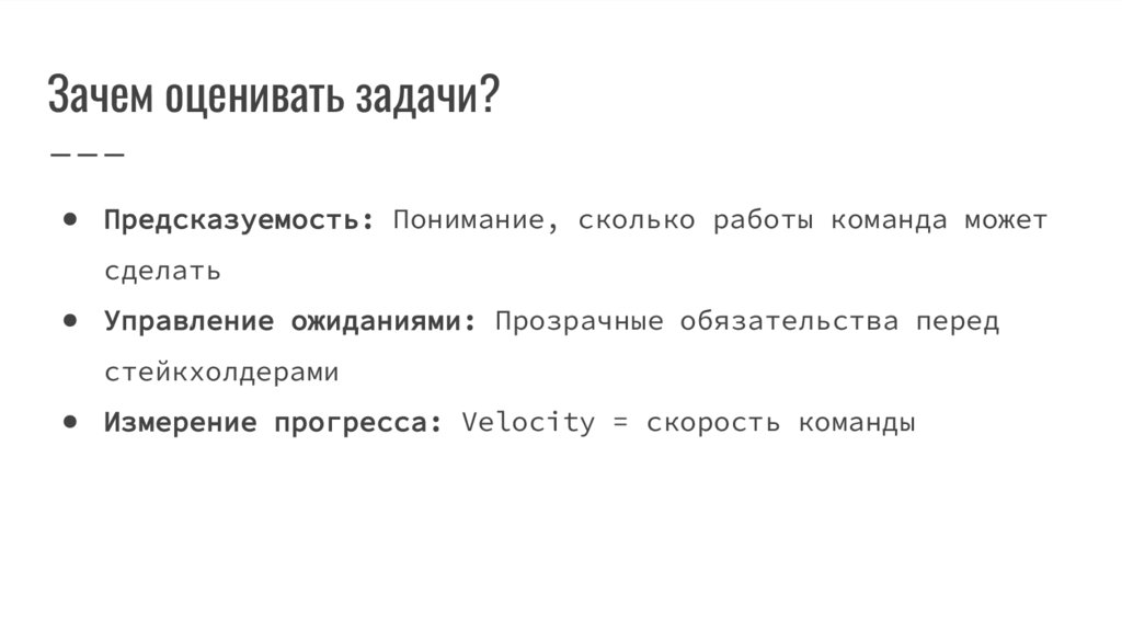 Зачем оценивать задачи?● Предсказуемость: Понимание, сколько работы команда может