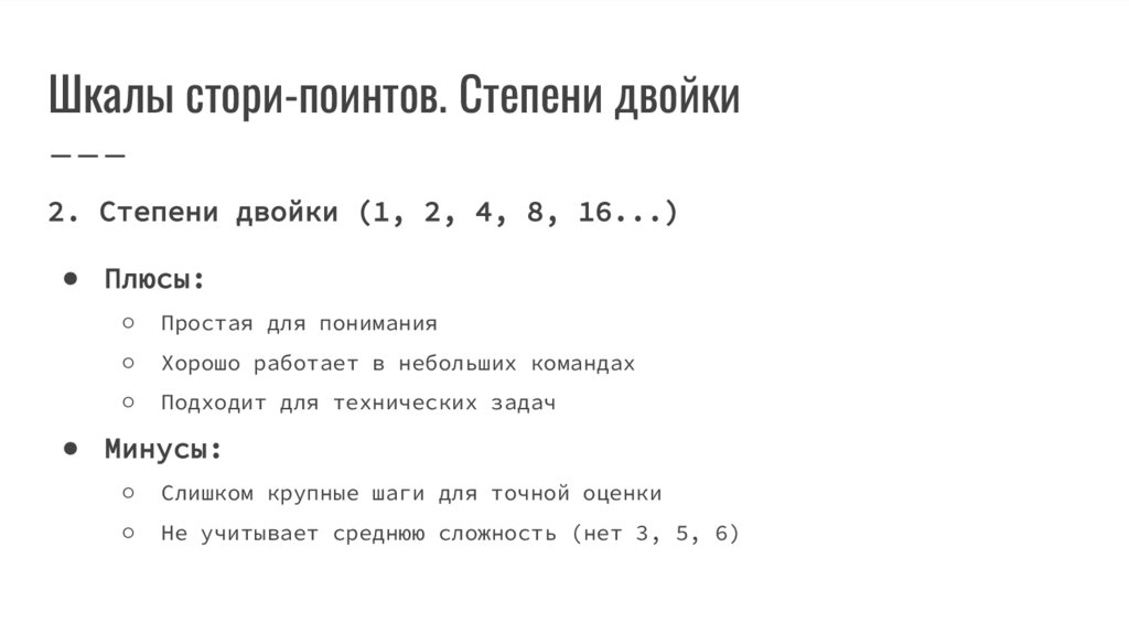 Шкалы стори-поинтов. Степени двойки2. Степени двойки (1, 2, 4, 8, 16...)