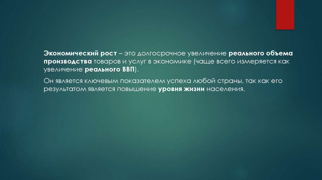 Экономический рост – это долгосрочное увеличение реального объемапроизводства товаров и услуг в экономике (чаще всего измеряется как