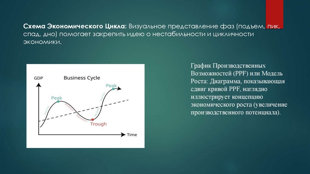 Схема Экономического Цикла: Визуальное представление фаз (подъем, пик,спад, дно) помогает закрепить идею о нестабильности и цикличности
