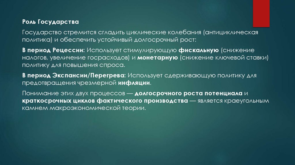 Роль ГосударстваГосударство стремится сгладить циклические колебания (антициклическая