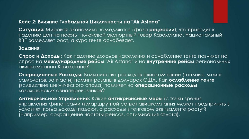 Кейс 2: Влияние Глобальной Цикличности на "Air Astana"Ситуация: Мировая экономика замедляется (фаза рецессии), что приводит к