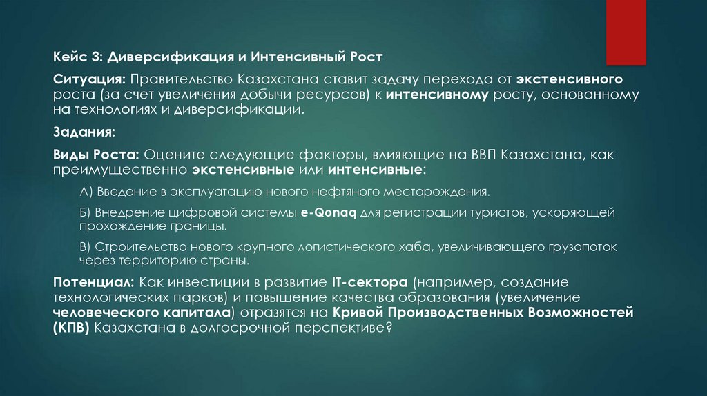 Кейс 3: Диверсификация и Интенсивный РостСитуация: Правительство Казахстана ставит задачу перехода от экстенсивного