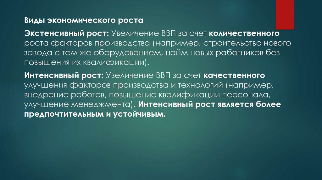 Виды экономического ростаЭкстенсивный рост: Увеличение ВВП за счет количественного