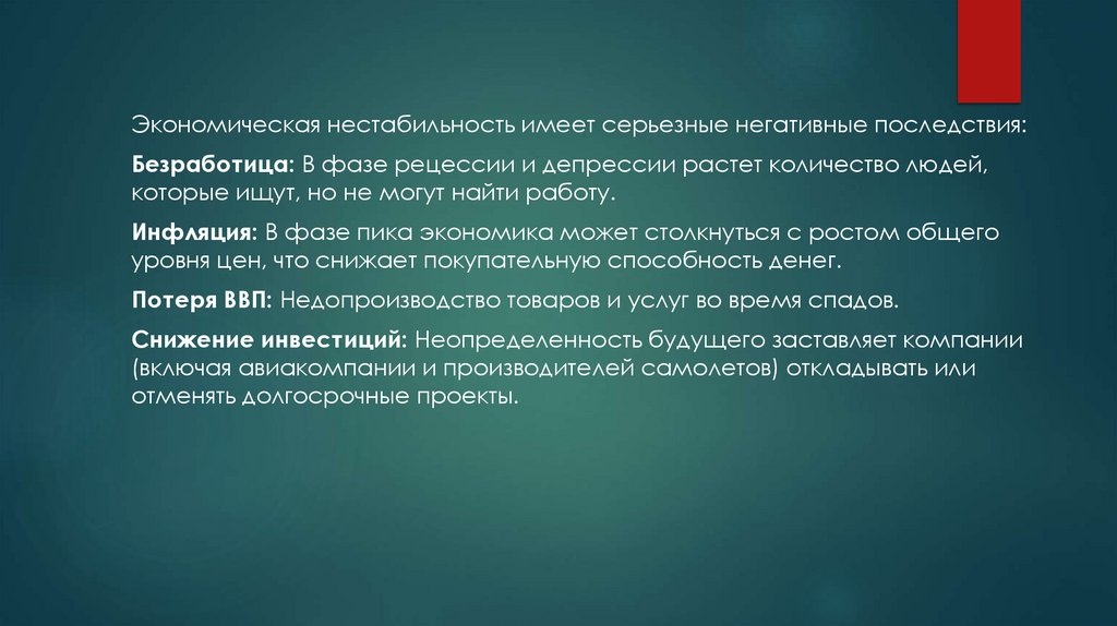 Экономическая нестабильность имеет серьезные негативные последствия:Безработица: В фазе рецессии и депрессии растет количество людей,