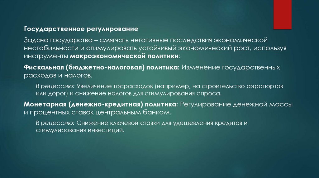 Государственное регулированиеЗадача государства – смягчать негативные последствия экономической