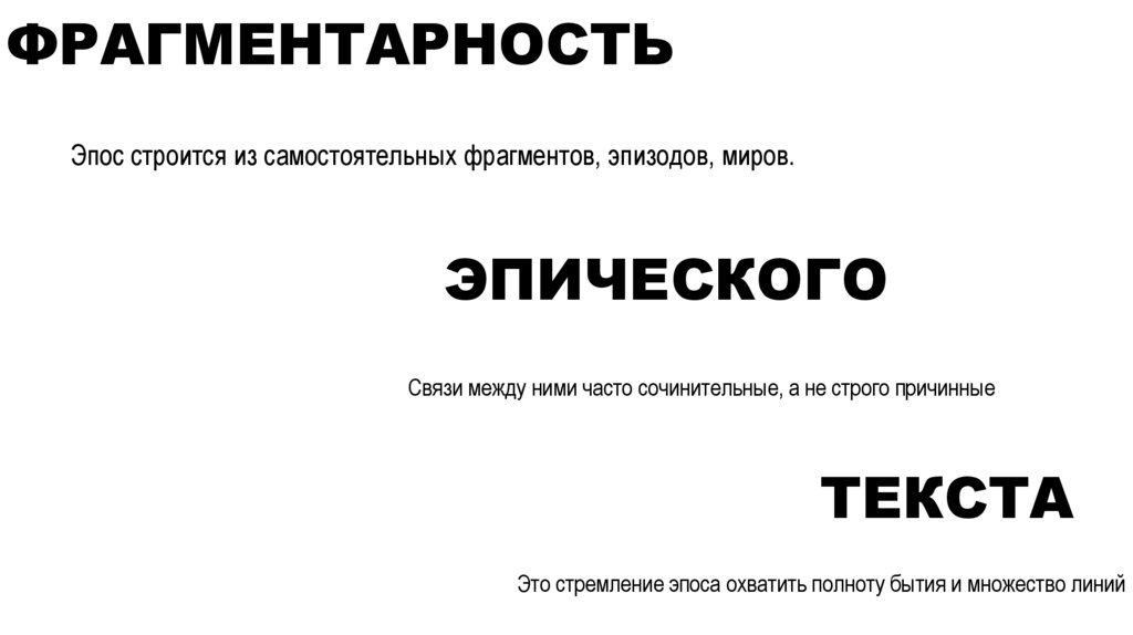 ФРАГМЕНТАРНОСТЬЭпос строится из самостоятельных фрагментов, эпизодов, миров.